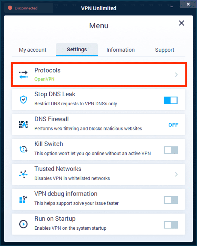 - انتقل إلى علامة التبويب Settings (الإعدادات) وحدد خيار Protocols (البروتوكولات).