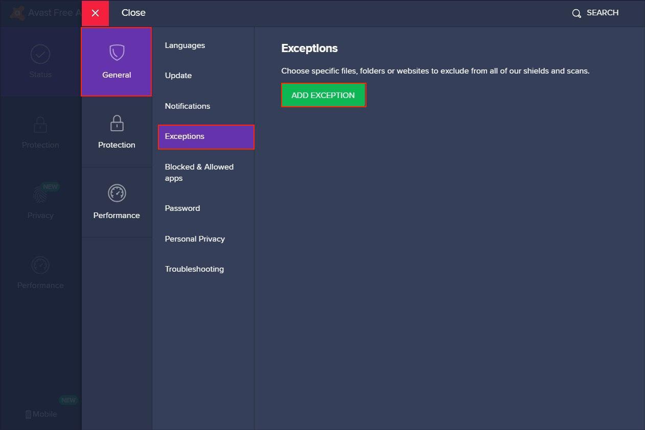 2. Rechercher l'onglet Exclusions (Exclusions) dans la section General settings (Paramètres Généraux). Appuyez sur Add Exception (Ajouter une Exception).