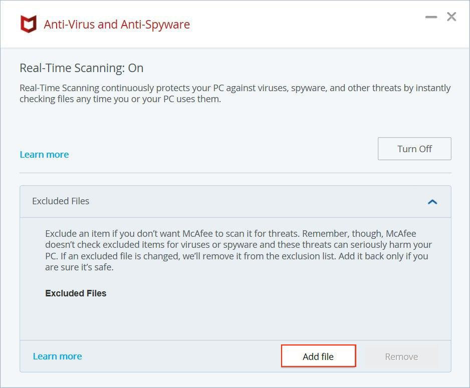 2. Accédez à la section Fichiers Excluded (Exclus) et appuyez sur Add File (Ajouter un fichier).
