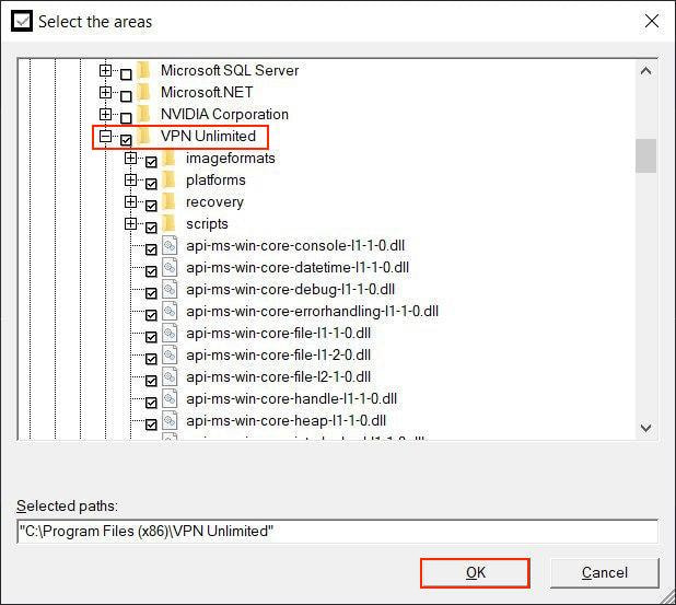 5. Cliquez sur OK pour continuer, et le nom du dossier VPN Unlimited apparaîtra dans Chemins de fichiers.