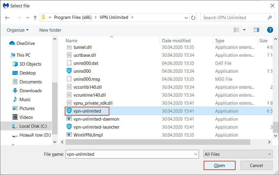 3. Naviguez au Local Disc C : (Disque Local C :) > Program Files > trouvez le dossier VPN Unlimited choisissez vpn-unlimited et cliquez sur Open (Ouvrir).
