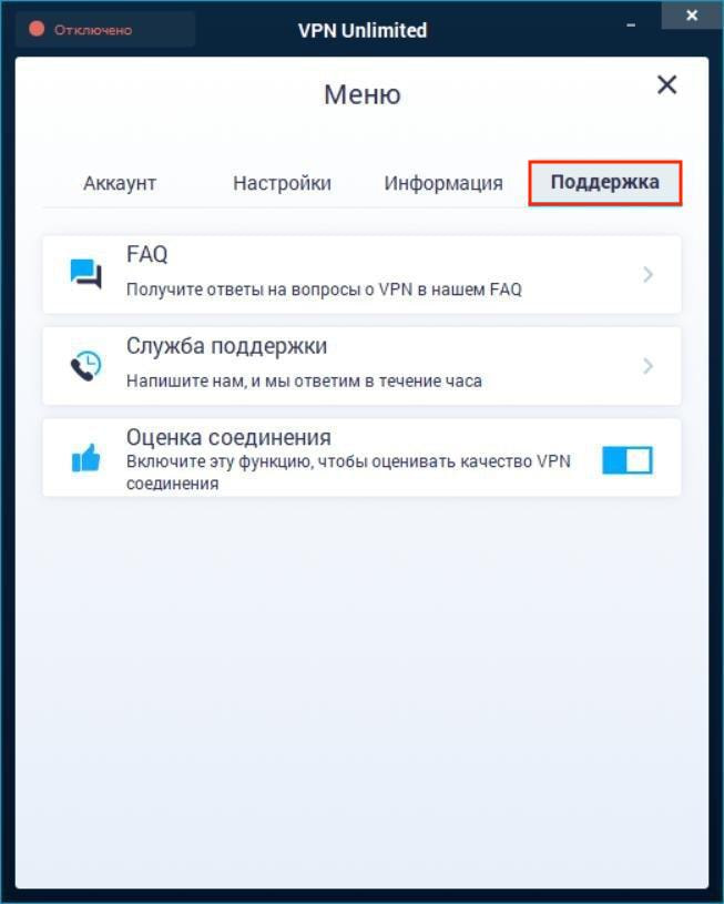 - Сервисные данные: если эта опция включена, мы будем вести учет ваших подключений и в случае возникновения каких-либо проблем, сможем быстрее вам помочь. Включите эту опцию, подключитесь к любому VPN серверу, перейдите на вкладку Поддержка > Служба поддержки, и журнал вашего подключения будет автоматически отправлен в нашу техническую поддержку.