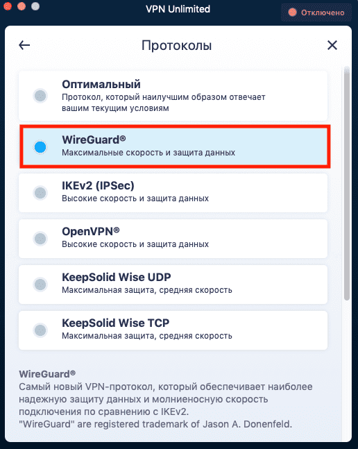 Помимо WireGuard®, VPN Unlimited для macOS предлагает множество других VPN-протоколов. Они включают OpenVPN®, IKEv2, а также специально разработанный протокол KeepSolid Wise, который позволяет преодолевать самые жесткие интернет-блокировки. Если вы не знаете, какой протокол использовать на вашем Mac, активируйте функцию Оптимальный, и лучший для вас вариант будет выбран ​​автоматически.